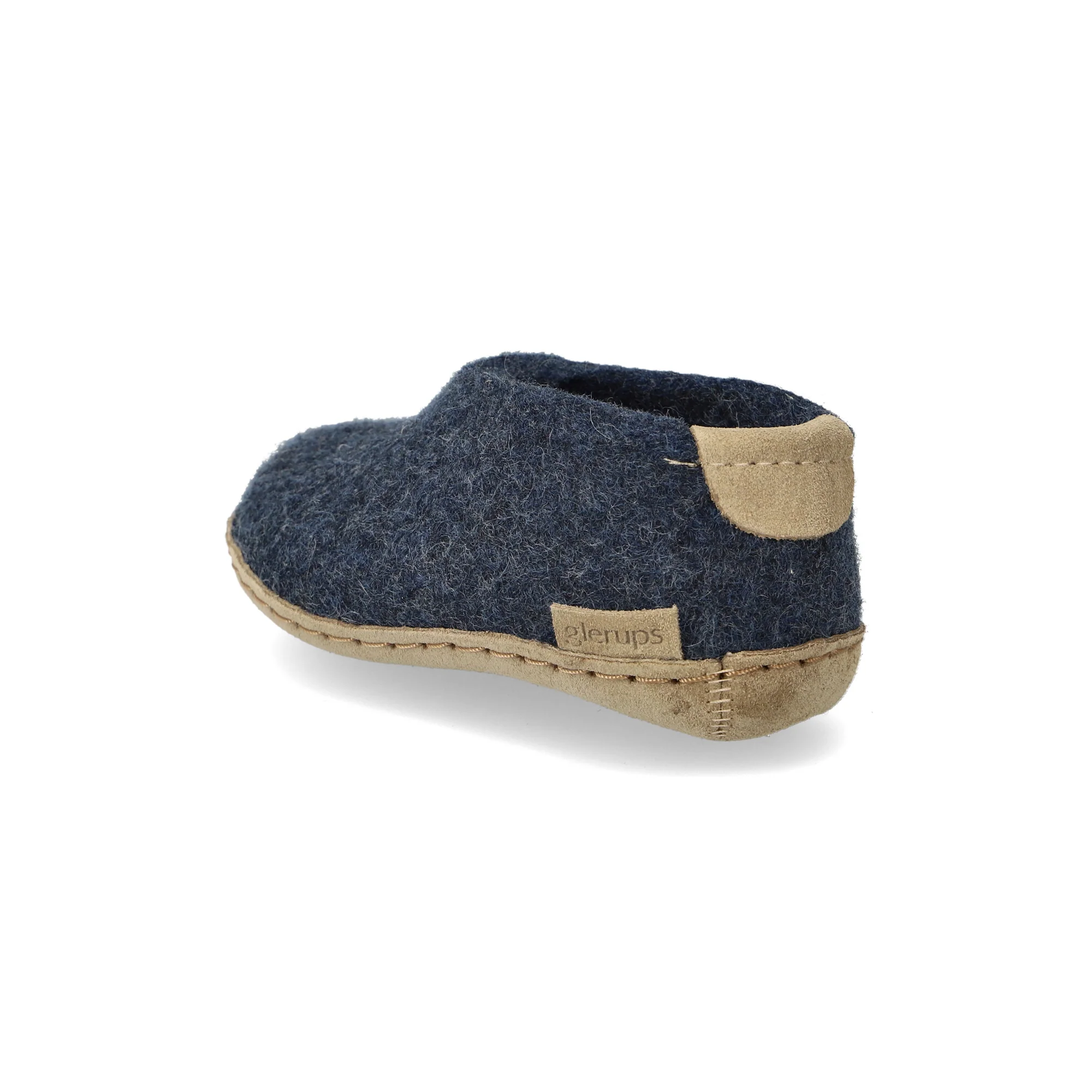 Our kids shoes/slippers are made of 100% pure, natural wool in the classic colour denim with a sole of soft and chrome-free calfskin. We started making slippers over 30 years ago - in fact, our founder Nanny Glerup made the first pair of slippers as a declaration of love to her husband Ove.
